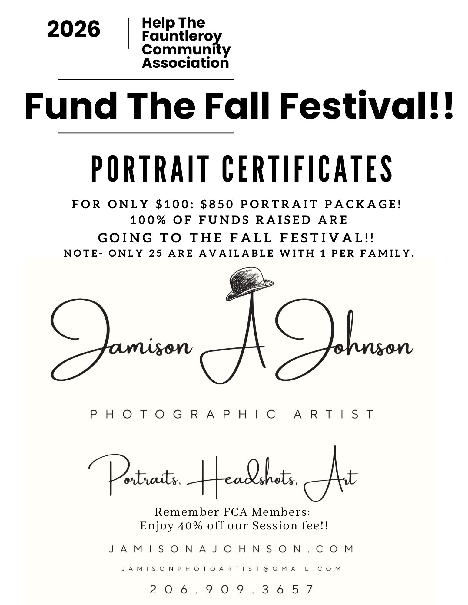 We have 25 Portrait Certificates available for the Fauntleroy Community Association Fall Festival and 25 available for the HPIC (Highland Park Improvement Club) Building Fund this year. This is our best deal and most direct fundraiser we have ever done. So what is the catch? The catch is they are a session and portrait around...